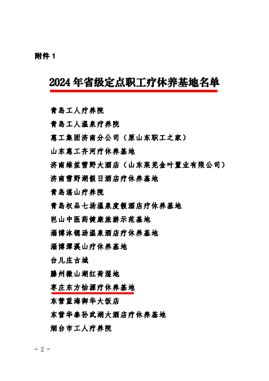 今天,省總工會下發(fā)通知,公布了2024年省級定點職工療休養(yǎng)基地名單,棗莊東方怡源療休養(yǎng)基地成功入選。